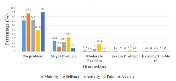The highest proportion of participants reported no problems in the anxiety/depression (90%, 72) and selfcare (87.5%, 70) dimensions. Activity (72.5%,58) and mobility (71.3%, 57) had slightly lower proportions, while pain was reported as a no concern by 48.8% (39) of participants. The most frequently reported slight problem was pain (32.5%, 26), followed by mobility (23.8%, 19). A smaller proportion of respondents experienced self-care (11.3%,9), anxiety/depression (7.5%, 6), and activity (21.3%, 17) problems. Pain remained the most affected domain, with 16.3% (13) of respondents reporting moderate issues. Activity was the next most common moderate issue at 5% (5). Mobility, self-care, and anxiety/depression had lower reports, at 2.5% (2), 1.3% (1), and 1.3% (1), respectively. The highest proportion of severe problem was in pain, with 2.5% (2) of respondents affected. Severe mobility and anxiety/ depression issues were reported by 1.3% (1), whereas no severe self-care issues were recorded. Only 1.3 % (1) participants reported extreme problems or being unable to perform tasks mobility and activity (Figure 1). The mean EQ index among the studied population was 0.901 ± 0.154. Mean VAS score was 81.1 ± 12.5 (Table 2).